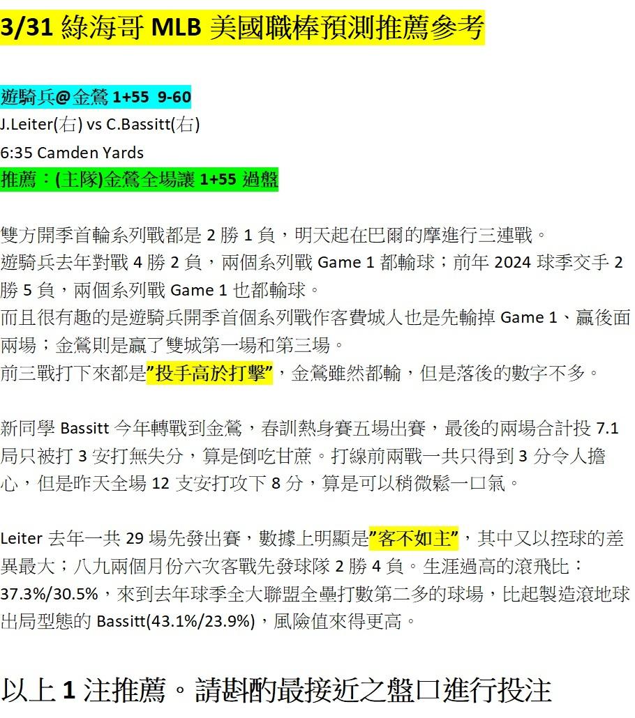 MLB >> 3/31 綠海哥MLB一場預測參考。單純分享,輸贏自負。隔壁還有NBA(留言無回覆,見諒)