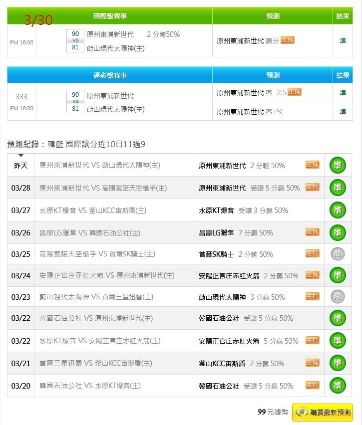 韓國職籃 >> 3/31韓籃國際讓分近10日11過9 昨天雙盤2過2全過 持續保持穩定獲利高勝率 今天單場推薦