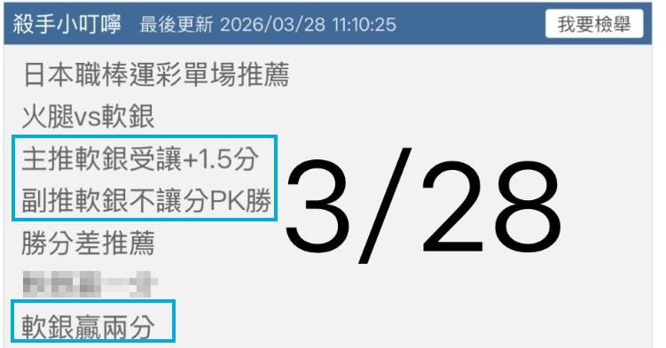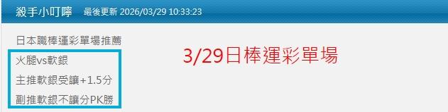 日本職棒 >> 3/31日棒 禮拜天小叮嚀推薦單場:軟銀受讓+軟銀PK都抓到 小叮嚀有今天單場:橫濱VS阪神推薦