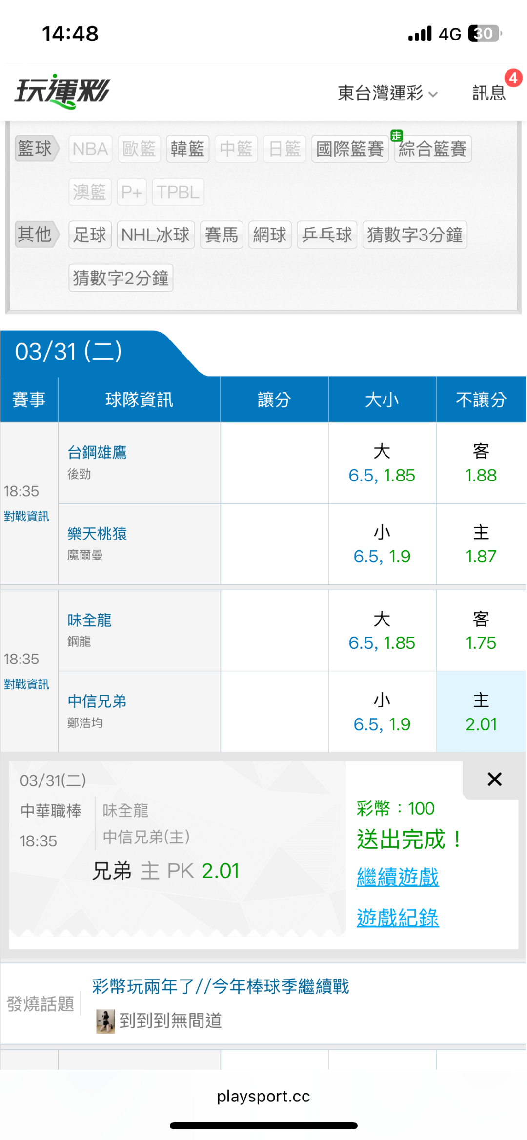中華職棒 >> 東台中職運彩【主推連過2日】【連贏2天4過3】主推信心滿滿(貓場)特價79-拼中職連贏3天~