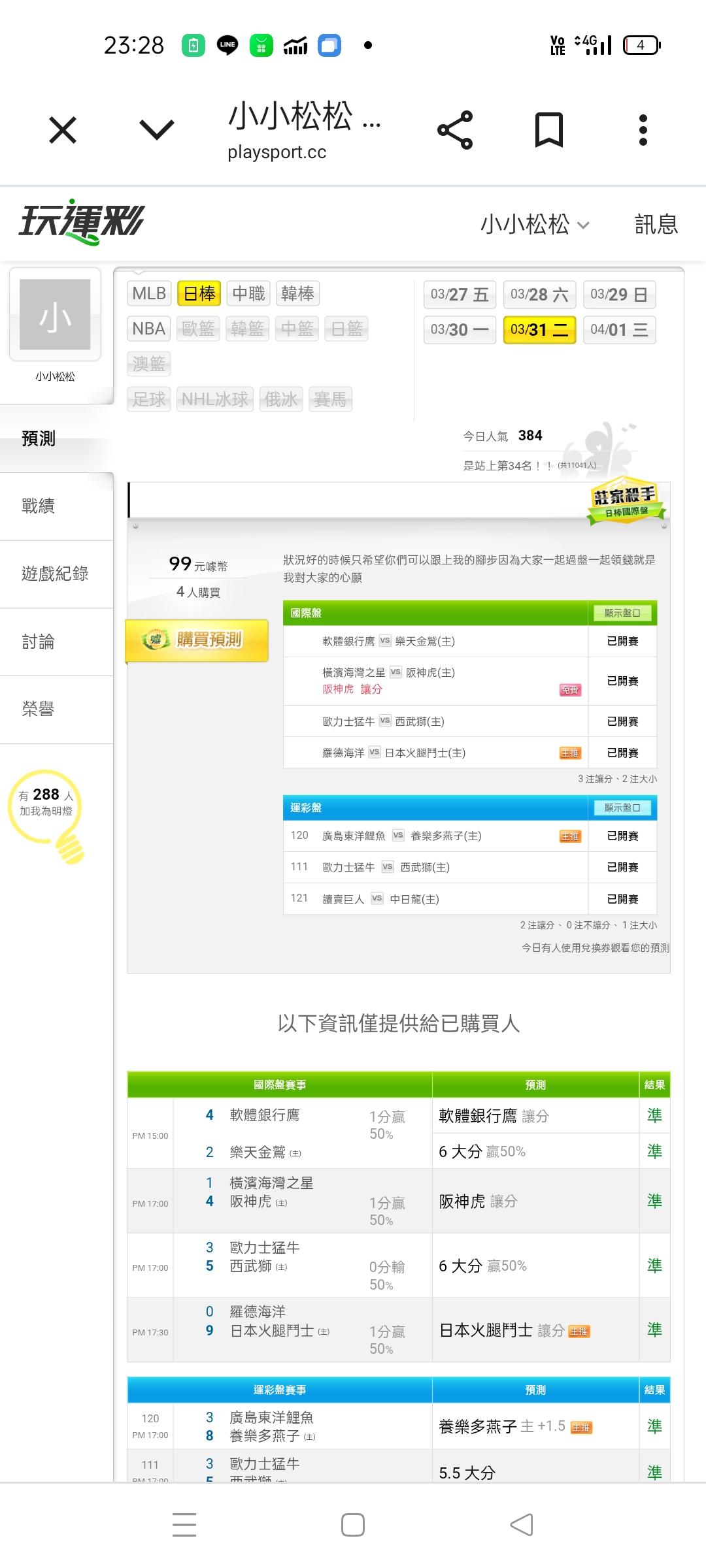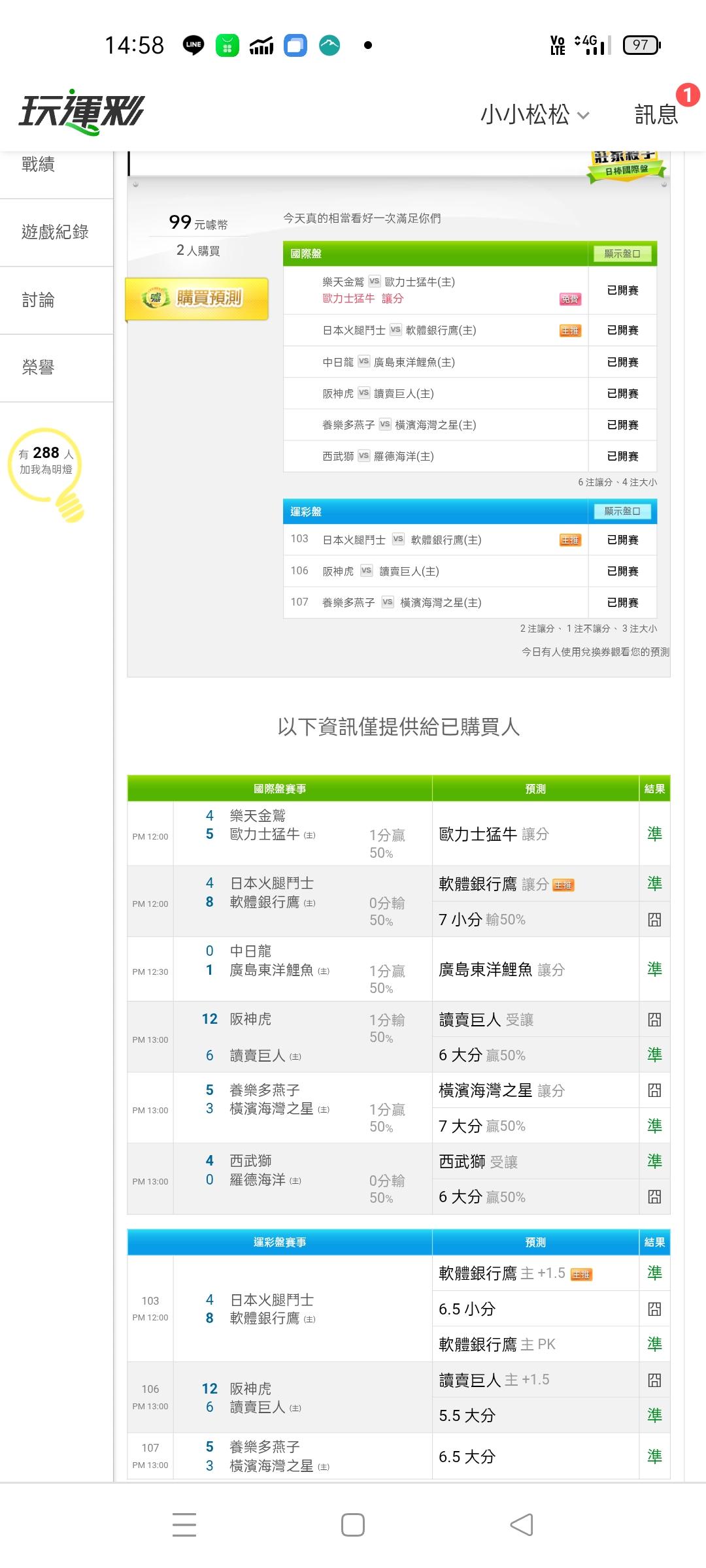 你是說今天日本職棒喔沒錯啊最近日本職棒還蠻準的也有四個人相信我還有人用兌换卷觀看我都很恭喜他們因為他們信任我我也不會漏氣的明天繼續送給你們贏錢的機會大家一起加油吧一起過盤