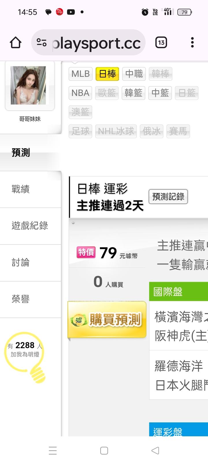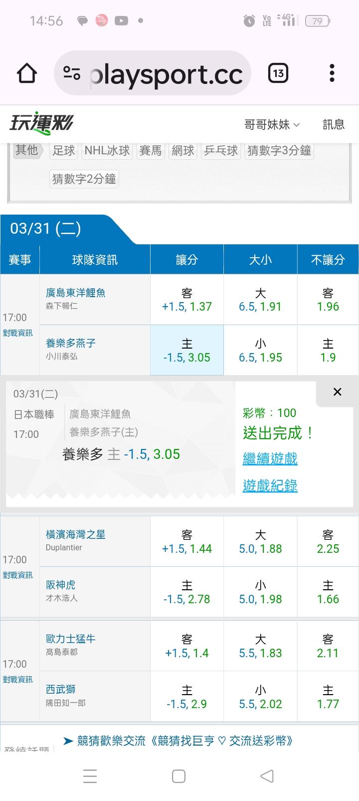 日本職棒 >> 主推連贏中(台彩單場大小分輸贏)橫濱vs阪神🤩🤩🤩