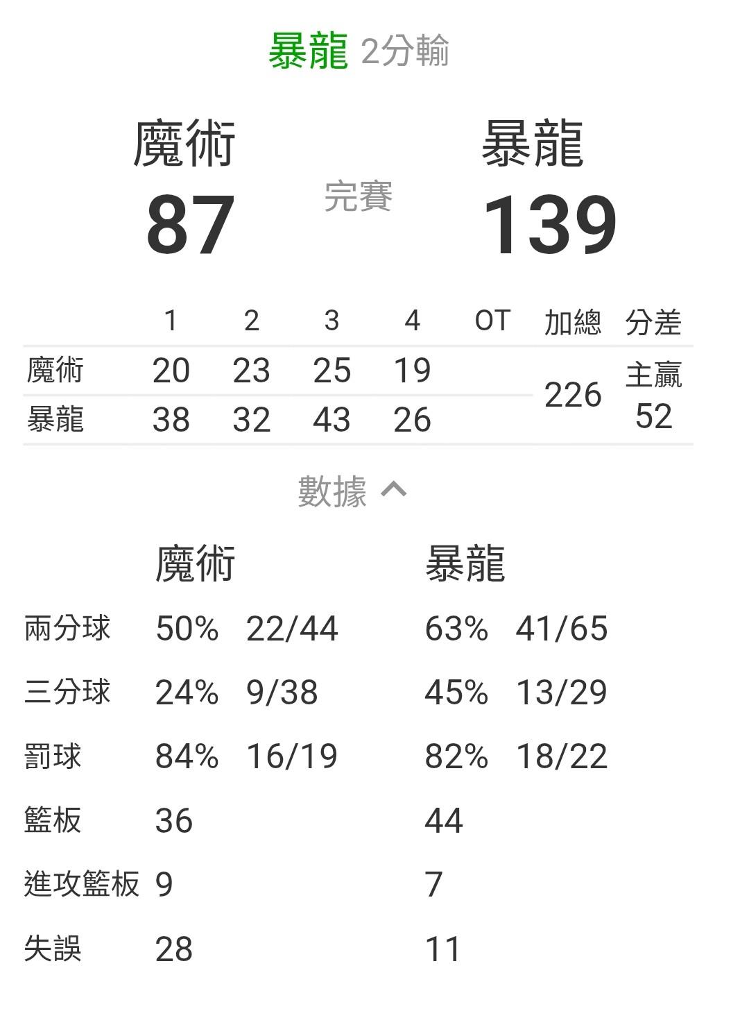 請看圖 2026年 3月30號 魔術以87分 輸給了暴龍的139分 狂輸52分