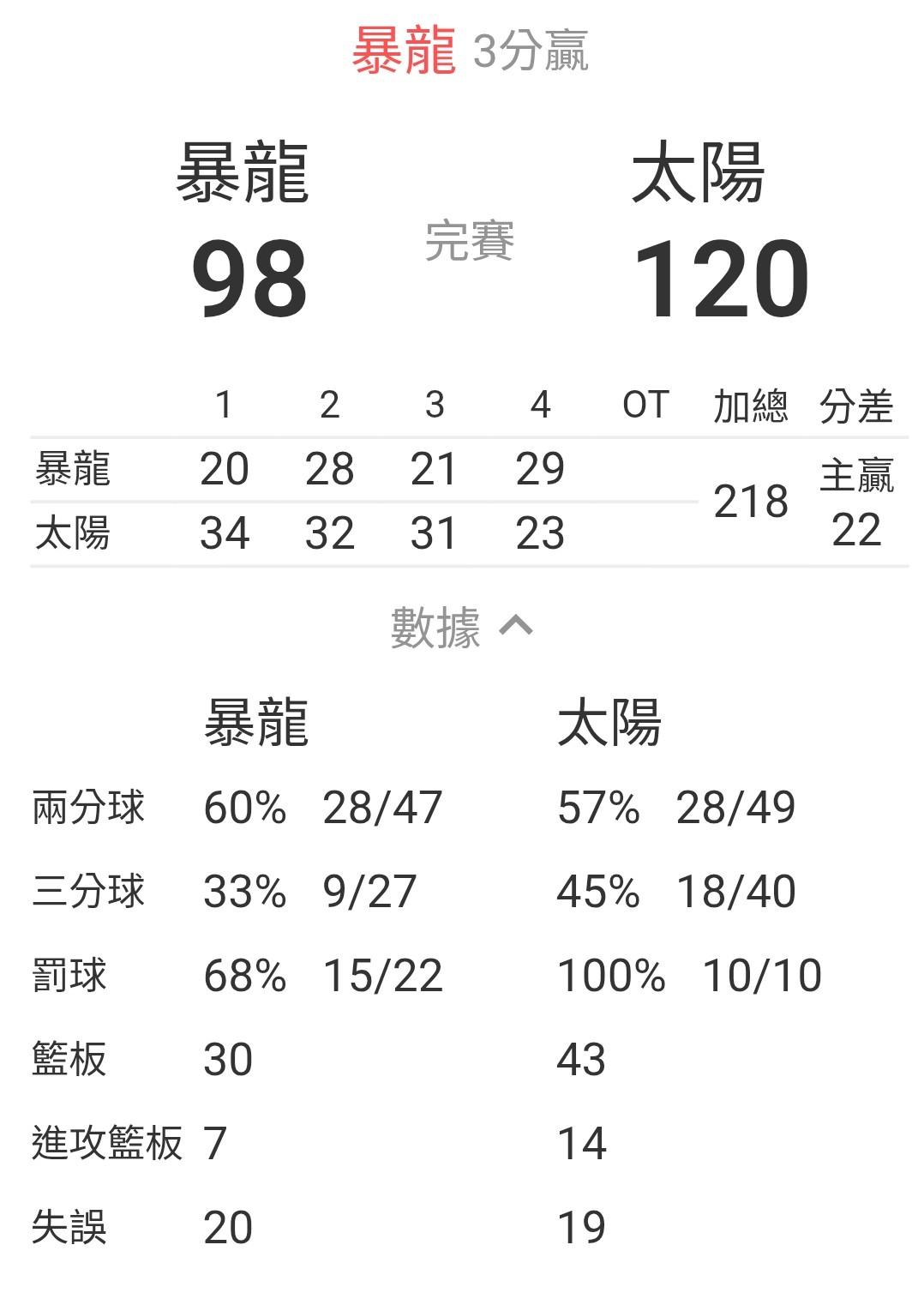 太陽贏暴龍22分 這代表太陽比暴龍強22分