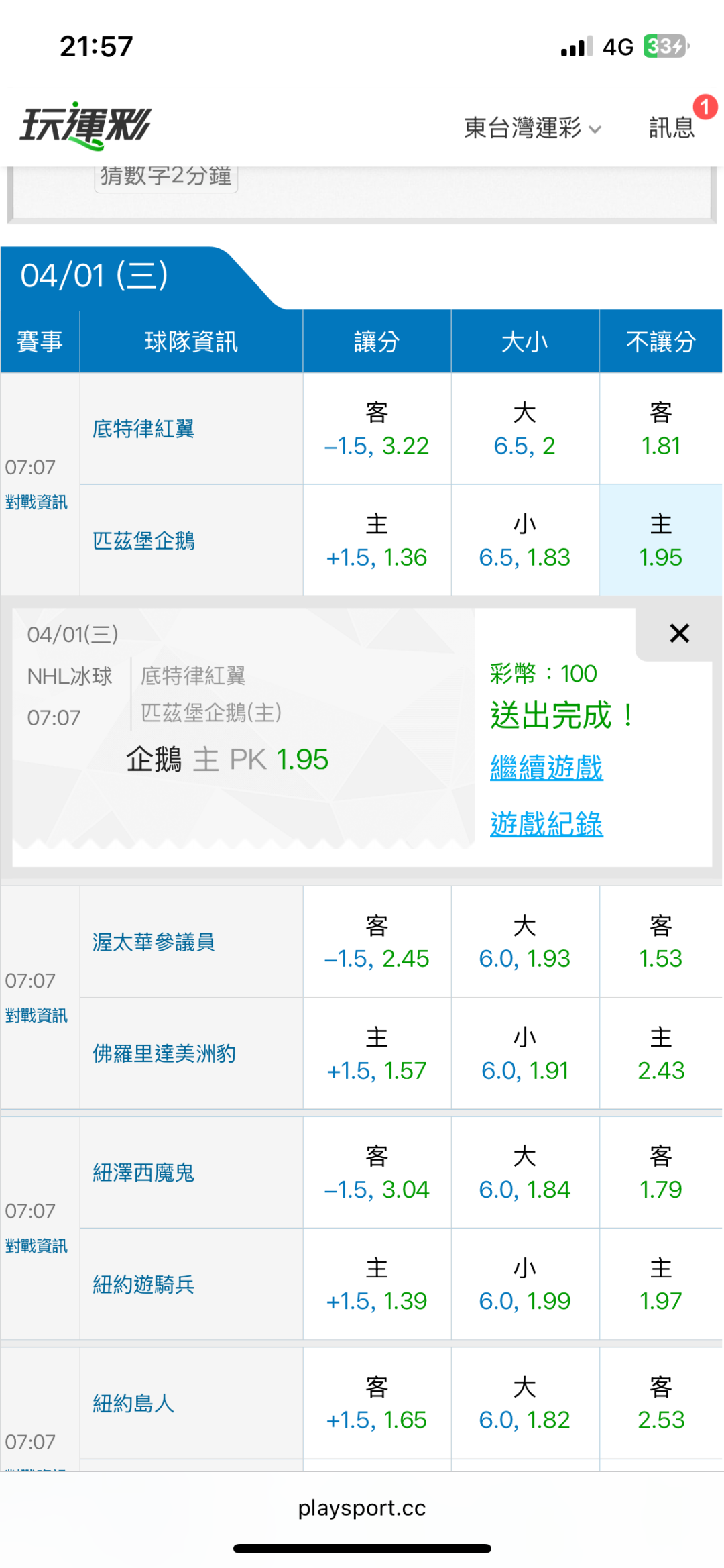 >> 4/1東台NHL國際盤【近25日贏22日】主推信心滿滿(貓場)特價用完了 喜歡的跟上東台~