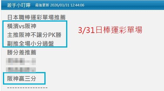 日本職棒 >> 4/1日棒 昨天小叮嚀推薦單場:阪神PK+小分+阪神贏三分勝分差都抓到 小叮嚀有今天單場