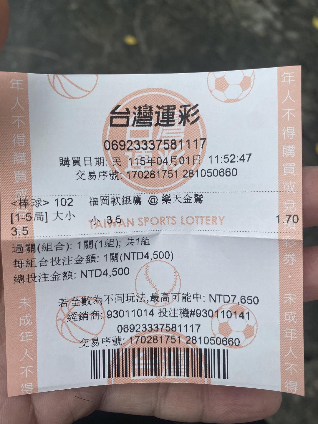 日本職棒 >> 軟銀樂天1-5局3.5小尻一張收7600元😎