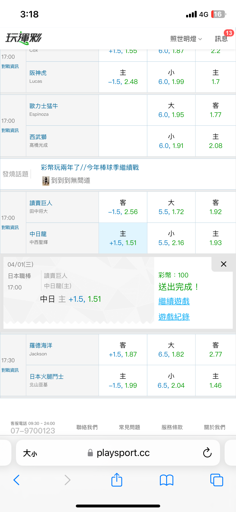 >> 日棒分享(今天2場單場已過1場)