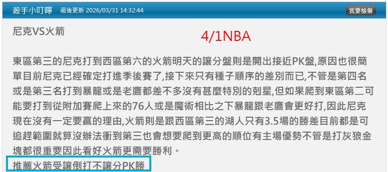 今天4/1小叮嚀分析文推薦單場:尼克VS火箭