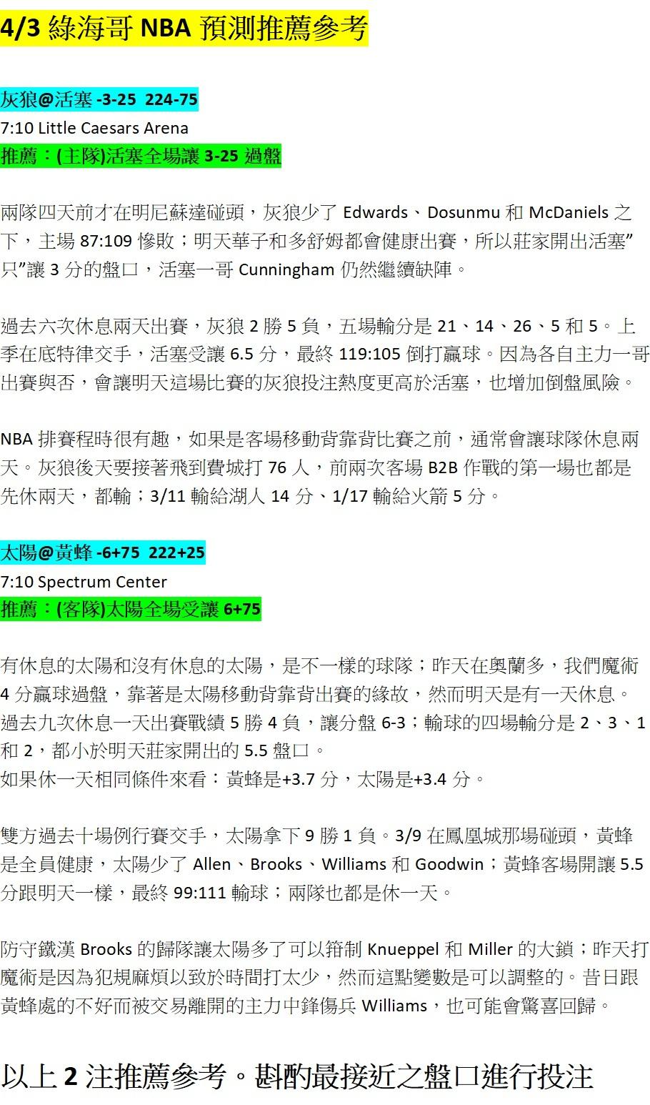 >> 4/3 綠海哥NBA兩場預測參考。單純分享,輸贏自負(留言無回覆,見諒)