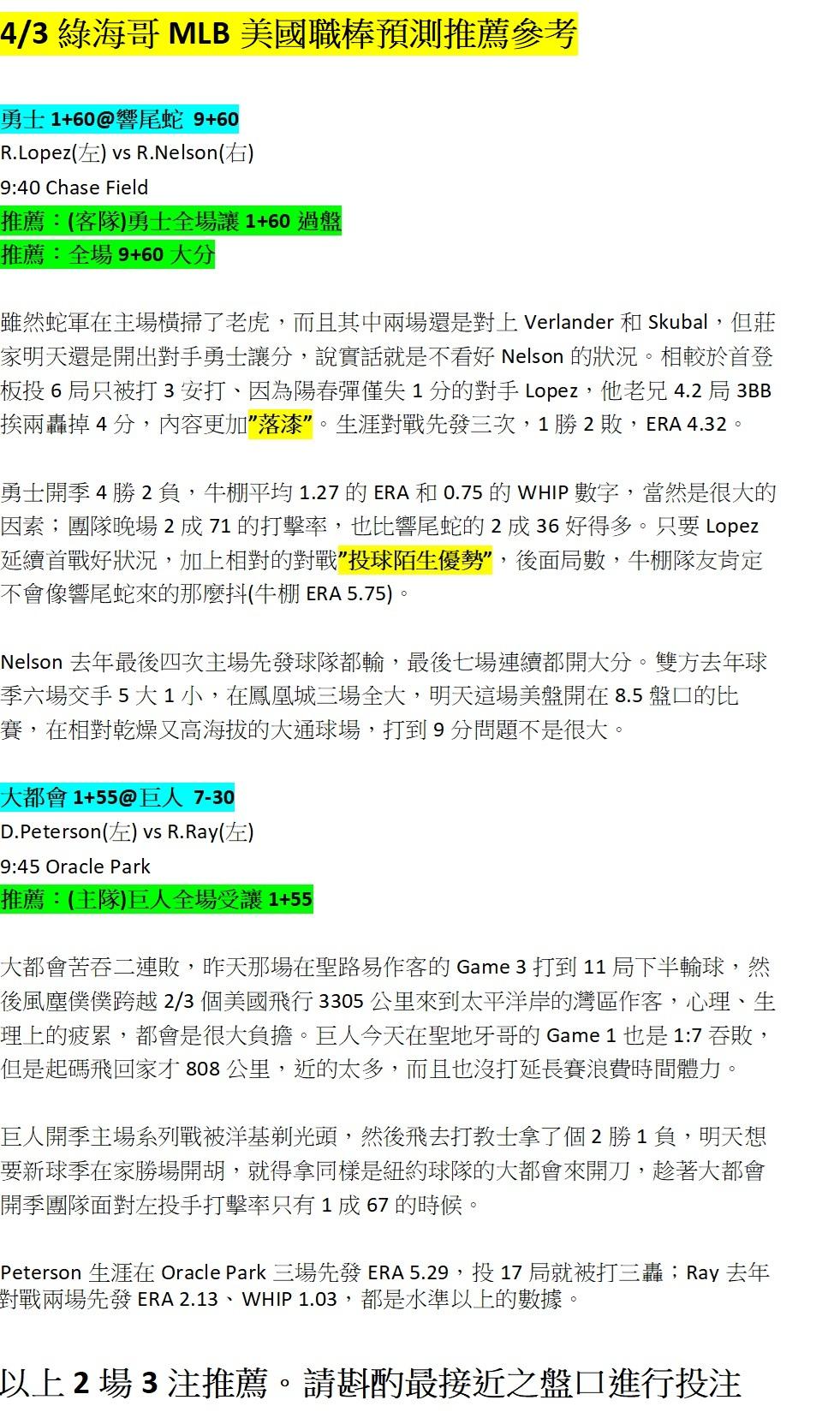 >> 4/3 綠海哥MLB三注預測參考。單純分享,輸贏自負。隔壁還有NBA(留言無回覆,見諒)