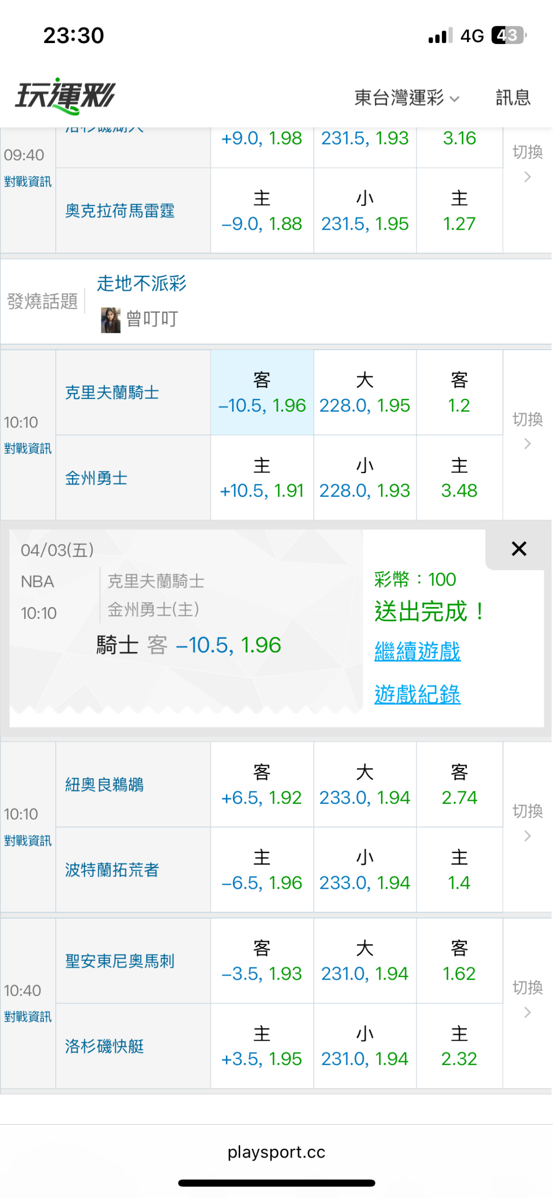 >> 4/3東台nba國際盤【主推近12日過9】主推信心滿滿(貓場)特價79 喜歡的跟上東台~