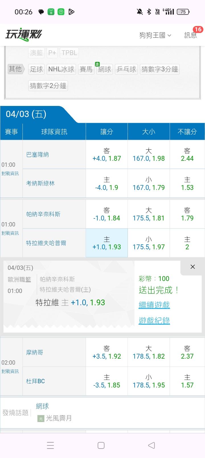 歐洲職籃 >> 歐洲籃球主推一場決勝負咬莊家02:00凌晨(杜拜vs摩納哥)