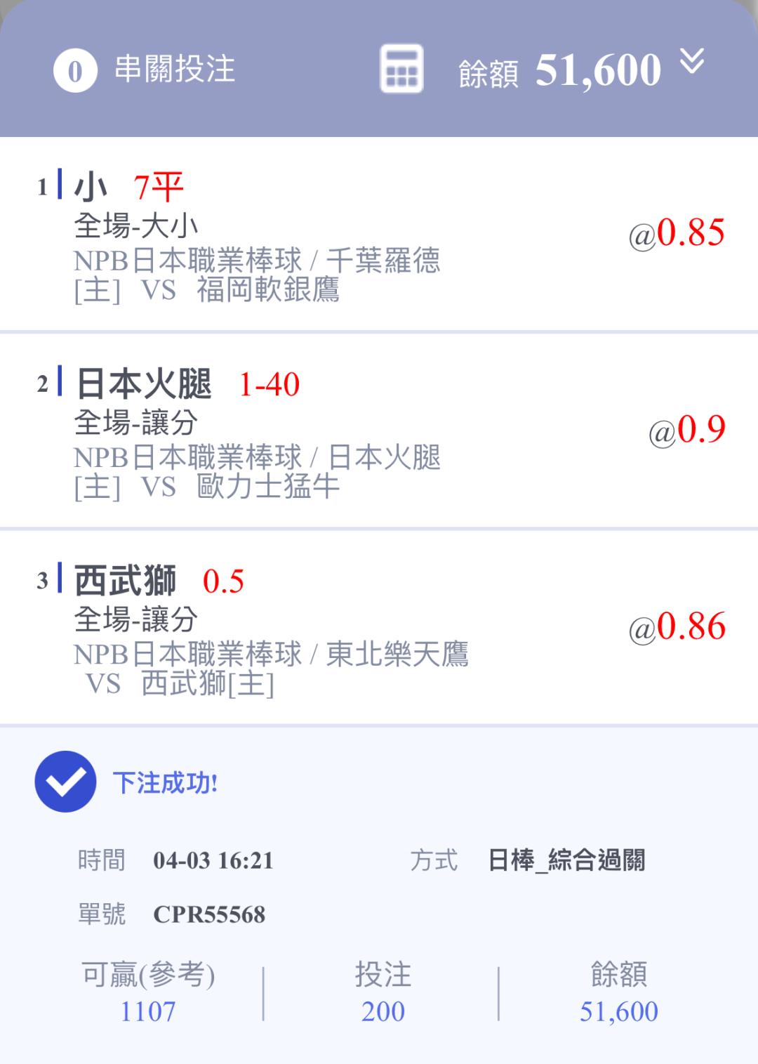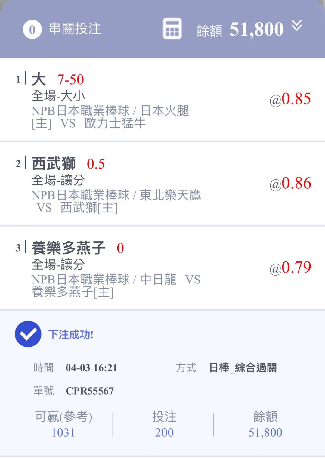 >> 3*1 *2 日棒主推四過三