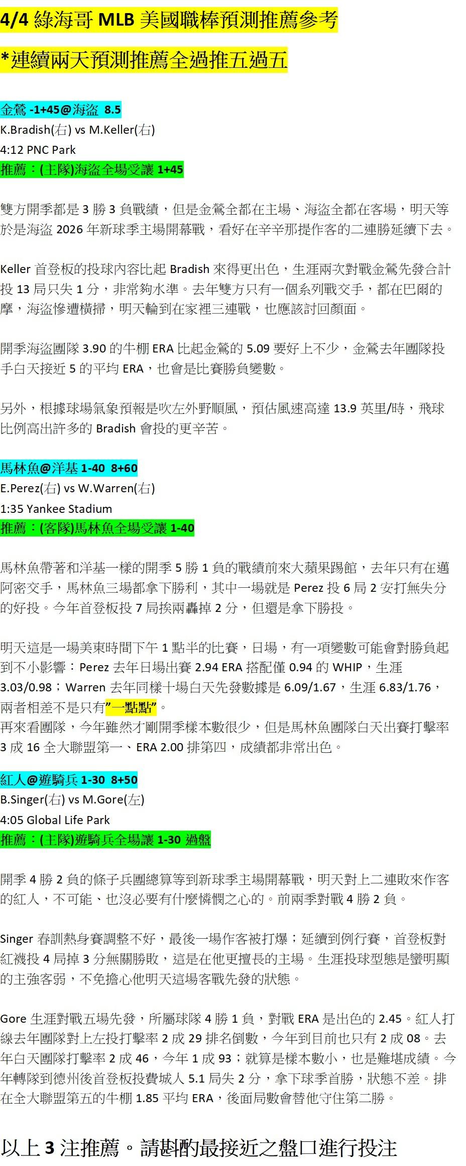 MLB >> 4/4 綠海哥MLB三注預測參考。單純分享,輸贏自負。推薦兩天五過五(留言無回覆,見諒)