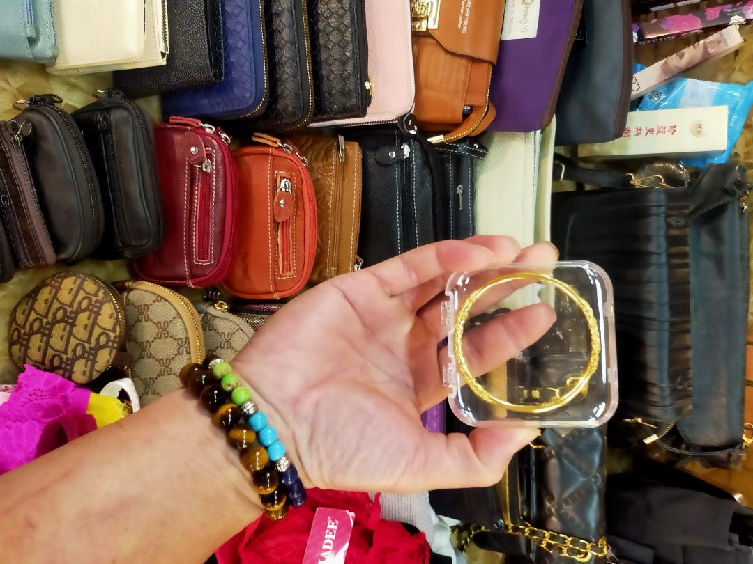 剛剛跑去賣皮夾包包的大姐攤位聊天,因為之前來擺攤如果有什麼吃的他都會請我吃,所以我剛剛送給他一個三太子的乾坤圈,他的手剛好可以戴進去