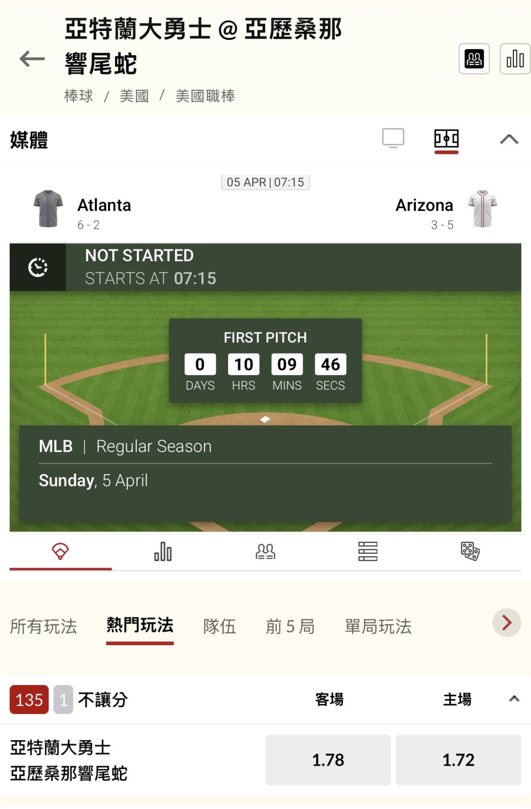 MLB >> 你們最愛的「單場 新台幣 10萬」亞特蘭大勇士 @ 亞歷桑那響尾蛇,這場直接用力力力力力