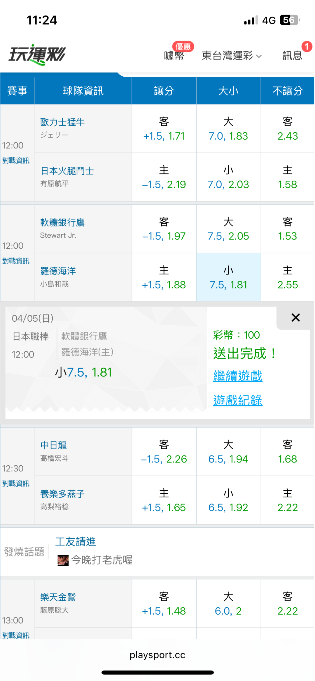 日本職棒 >> 4/5東台日棒國際盤【連贏5天22過15】主推信心滿滿(貓場)特價79-拼日棒國際連贏6天~