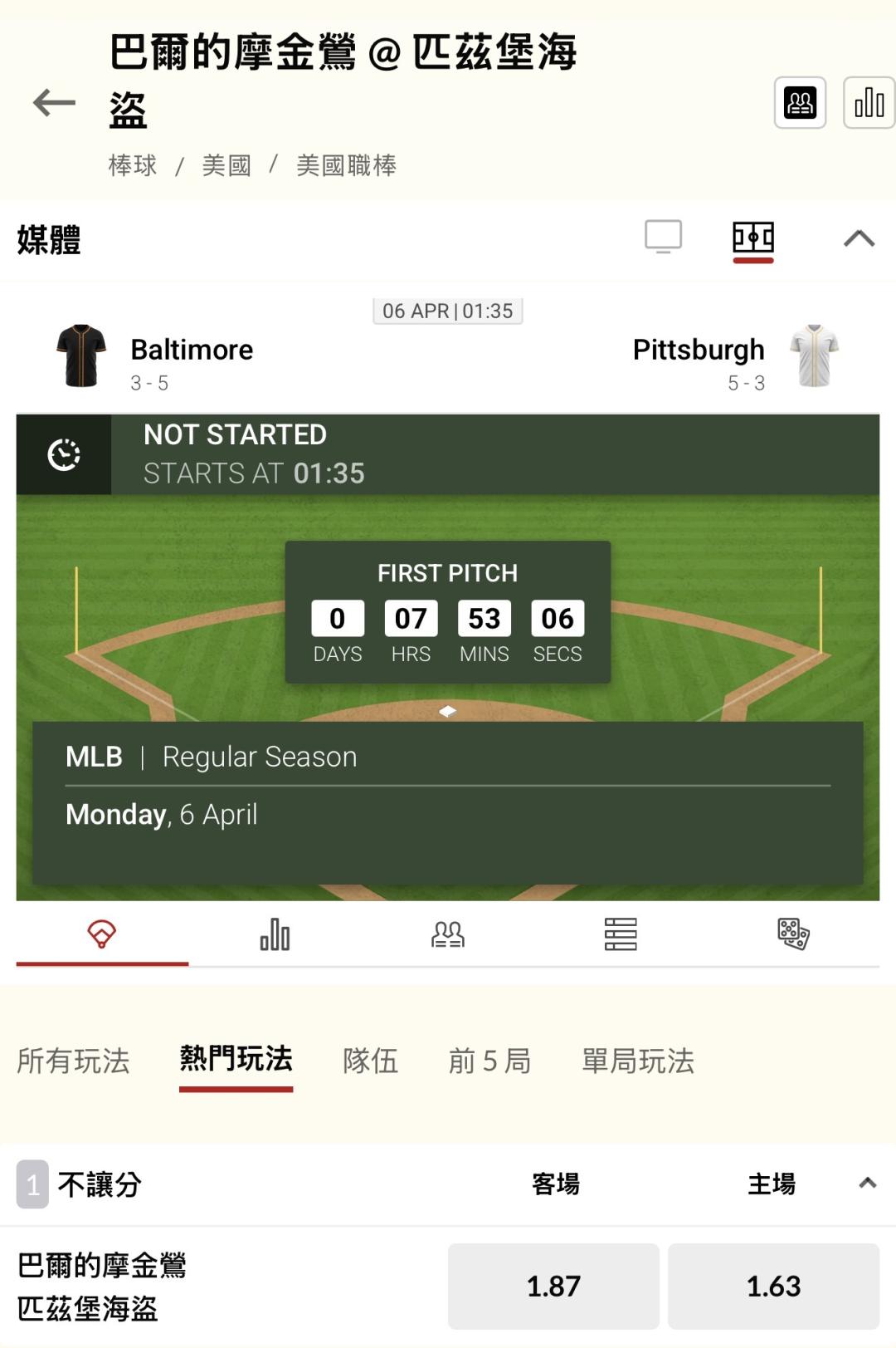 MLB >> 單場「新台幣 10萬」巴爾的摩金鶯 VS 匹茲堡海盜,國際讓分連贏5天5過5