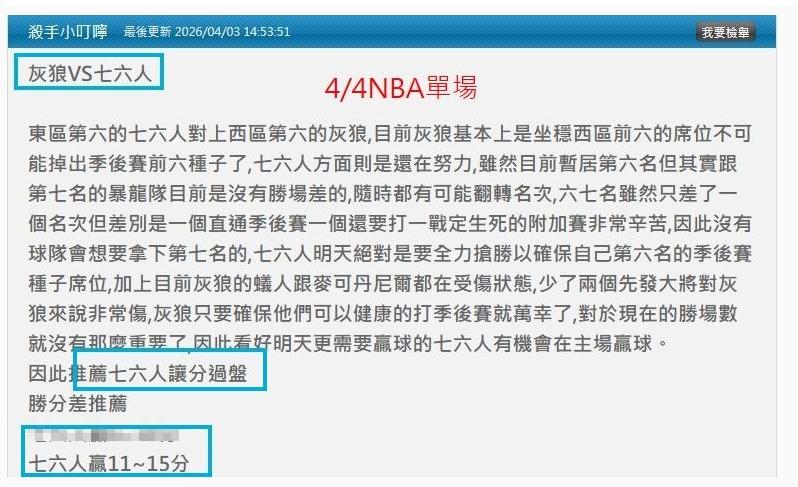 NBA >> 4/6NBA運彩主推近8過7 昨天小叮嚀推薦單場:76人讓分+贏12分勝分差都抓到 小叮嚀有明單場