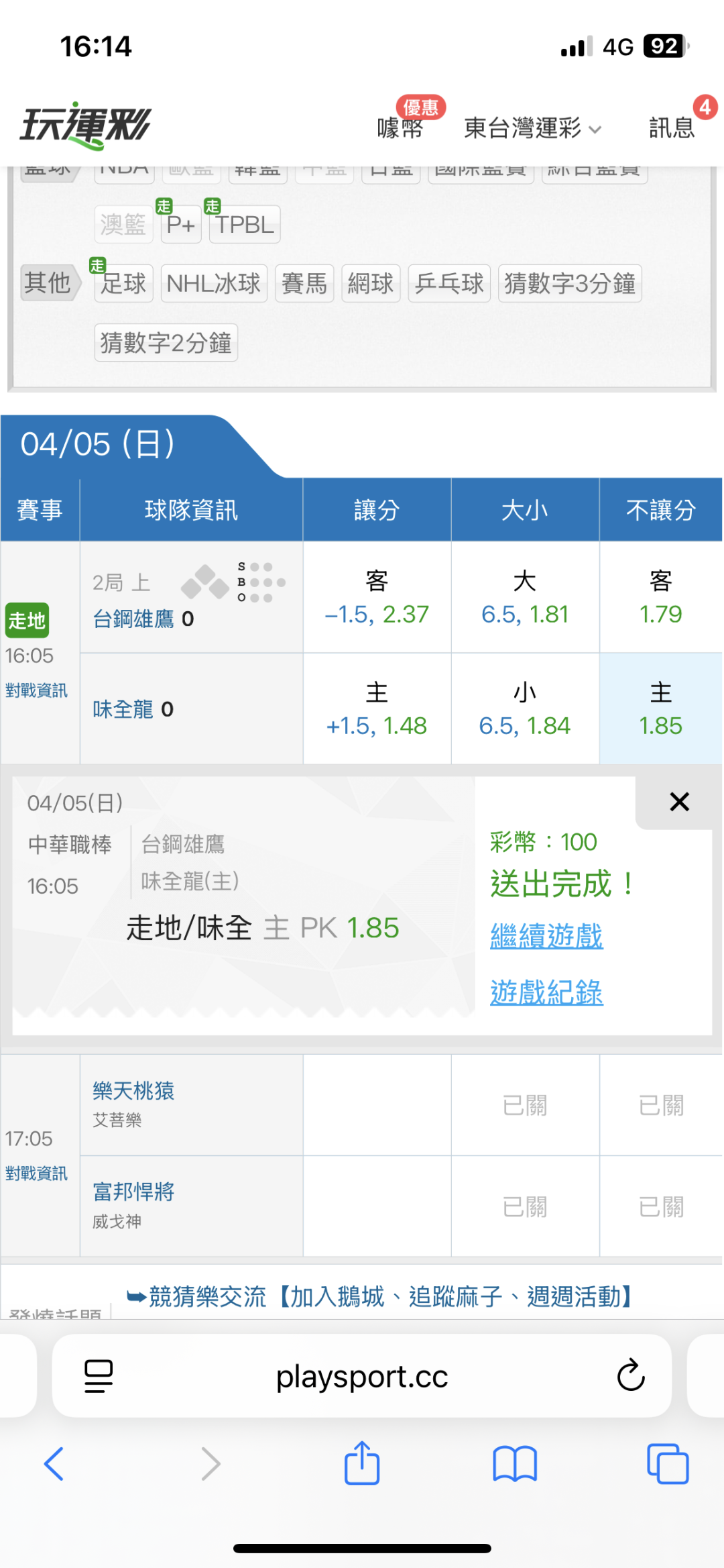 >> 4/5東台中職運彩【連贏2天6過4】主推信心滿滿(貓場)特價中 -拼中職連贏3天~