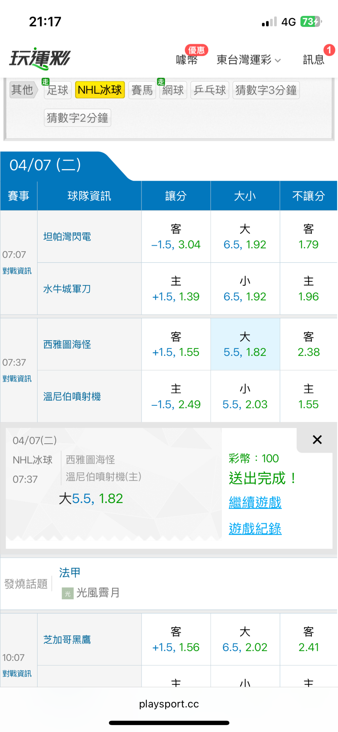 NHL冰球 >> 4/7東台NHL國際盤【近31日贏27日】主推信心滿滿(貓場)特價用完了 喜歡的跟上東台~
