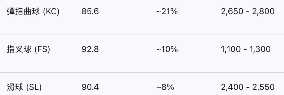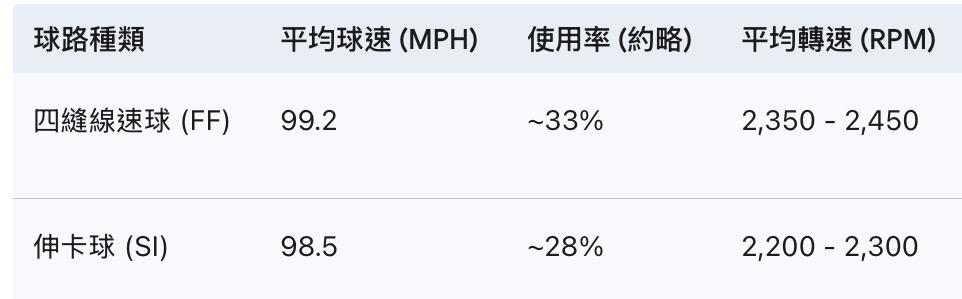 整體來說:他的球種以「高球速、高位移」為主。如果你在追蹤他的比賽,可以特別觀察他的曲球 (Curveball),那種高達 2,700+ RPM 的轉速落差常讓打者反應不及。