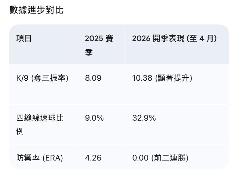 進化:他從原本「只會投低位伸卡球」的強力投手,在 2026 年進化成一個能用「百哩高位速球」與「大位移曲球」交織攻擊的全方位先發。
