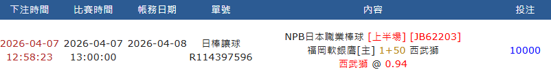 日本職棒 >> 阿德牌~13:00場 亂買一個看比賽