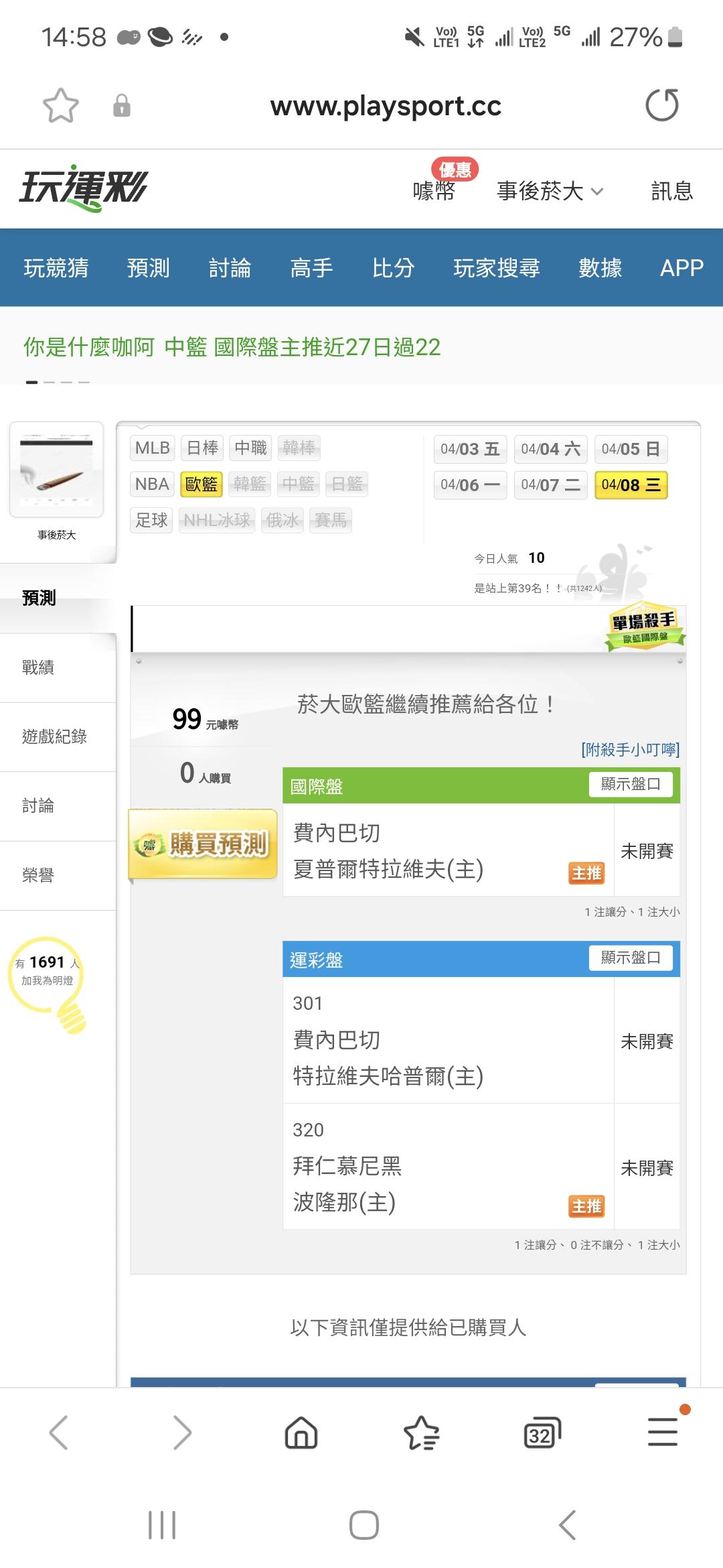 歐洲職籃 >> 菸大歐籃巴兒幹你亞Vs馬卡分析文