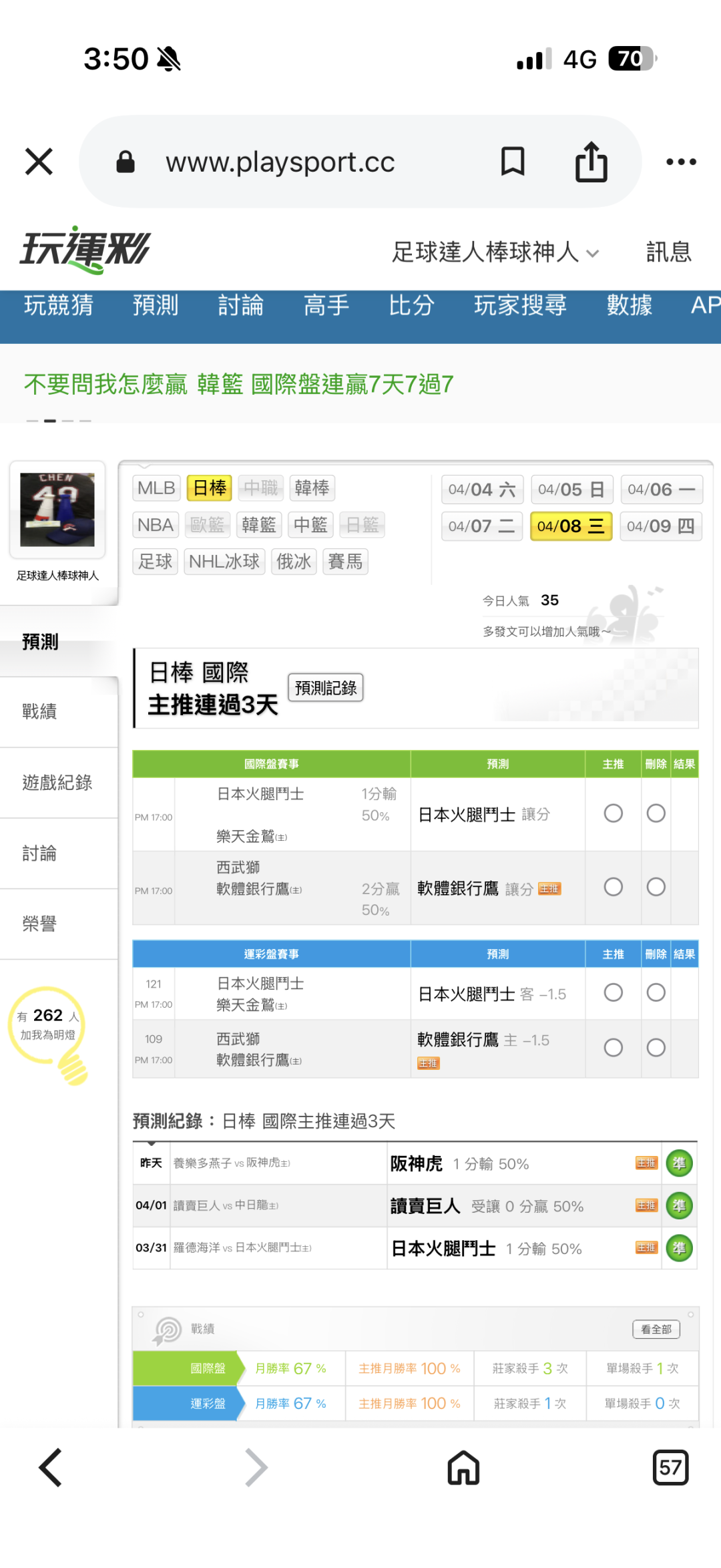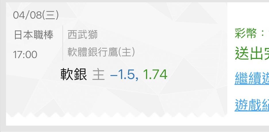 今天支持一下小徐先發,軟銀最近打擊火力不錯,徐若熙只要穩穩的投不要爆,基本上勝投可輕鬆入袋,支持一下,上車走~~