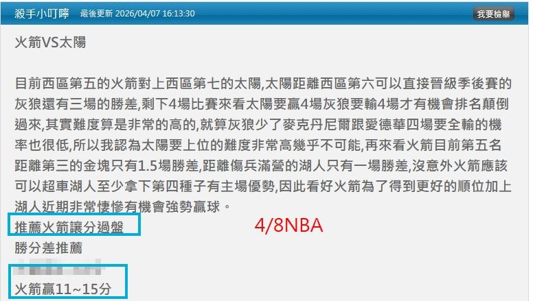 NBA >> 4/9NBA國際主推近11日過9 今天雙盤4過4 今分析文推薦單場:火箭讓分+贏14分勝分差都抓到