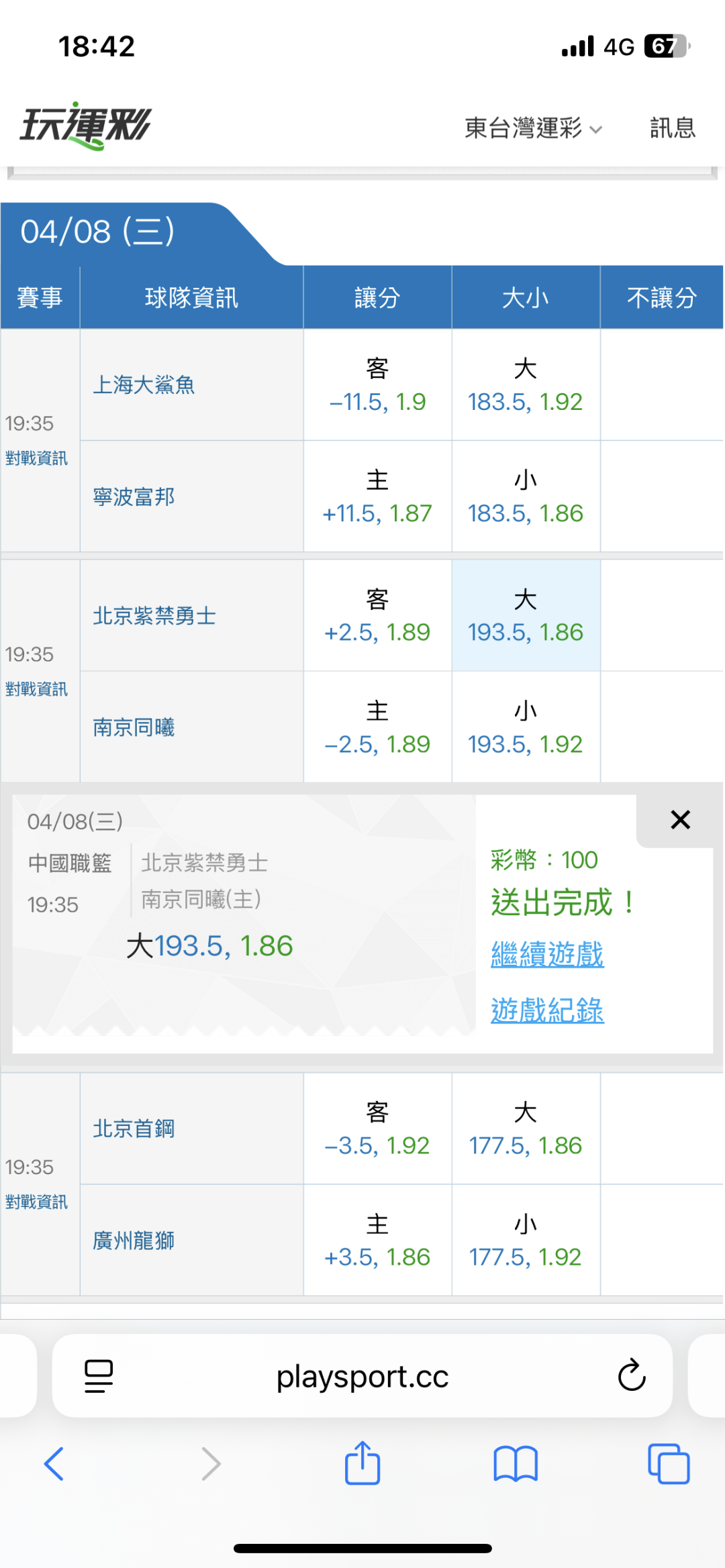 >> 4/8東台中籃國際盤【近22日贏19日】主推信心滿滿(貓場)特價79 喜歡的跟上東台~