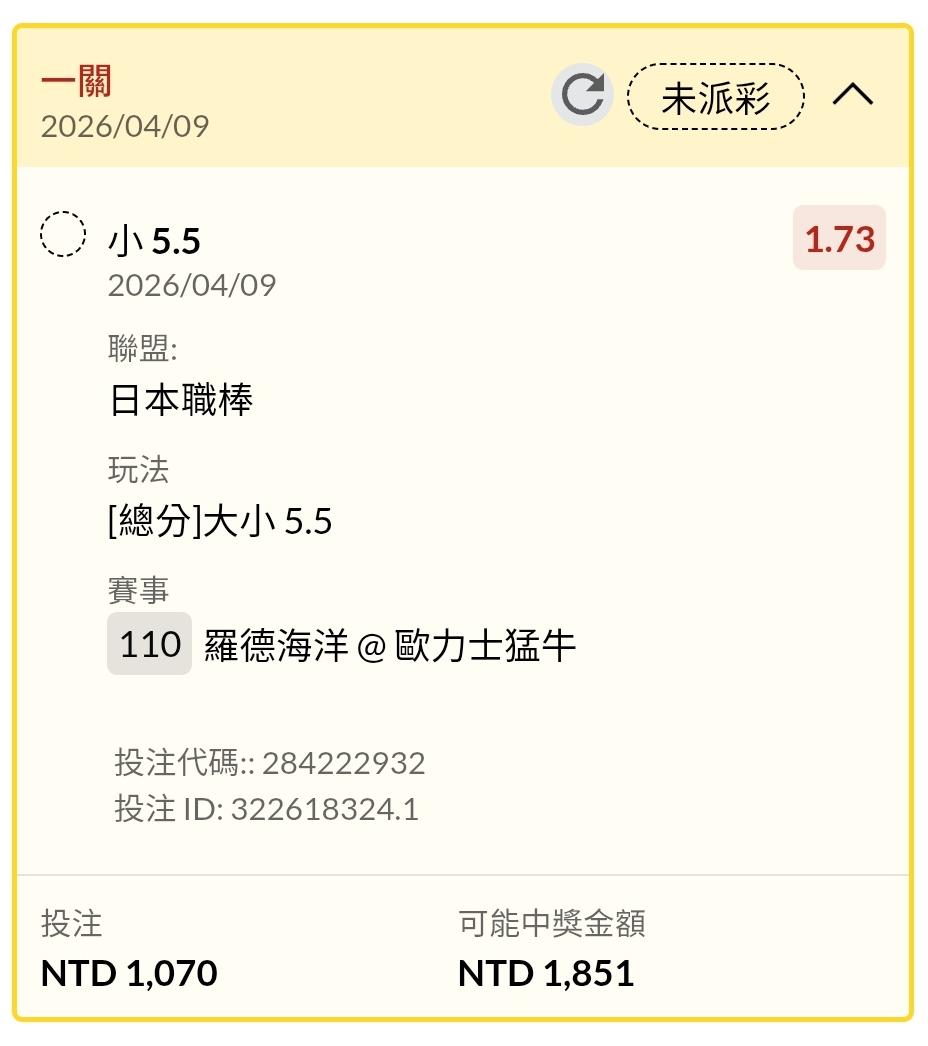 日本職棒 >> 4/9 羅德vs牛牛 5.5小