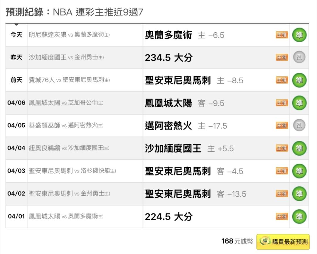 >> 4/10 NBA 運彩主推近9過7 免費推薦