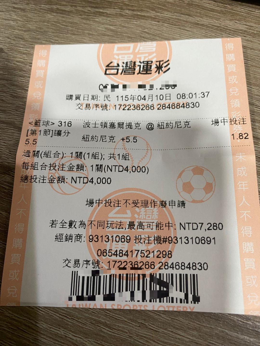 >> 驚險啦買到第一節尼克+5.5 高賠1.82. 4000元.收米