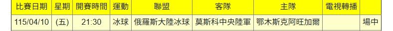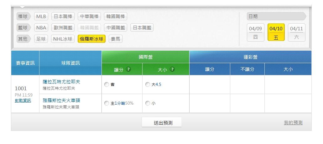 >> 4/10俄羅斯冰球 今天有一場比賽 單場:薩拉瓦特尤拉耶夫v.s.雅羅斯拉夫爾火車頭 要一起玩嗎?