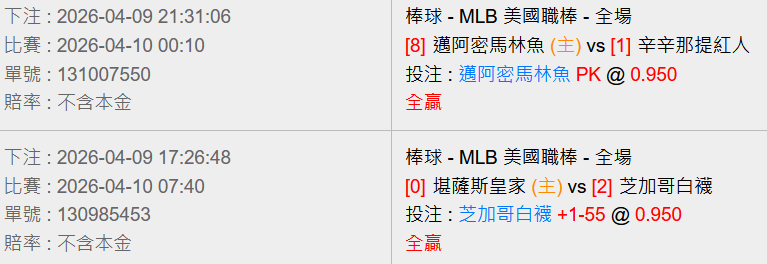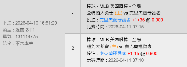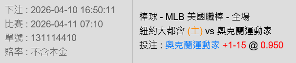 MLB >> 4/11【雙盤全過=6個準】【國際主推70%】運動家受讓+2X1+3X1推薦!!