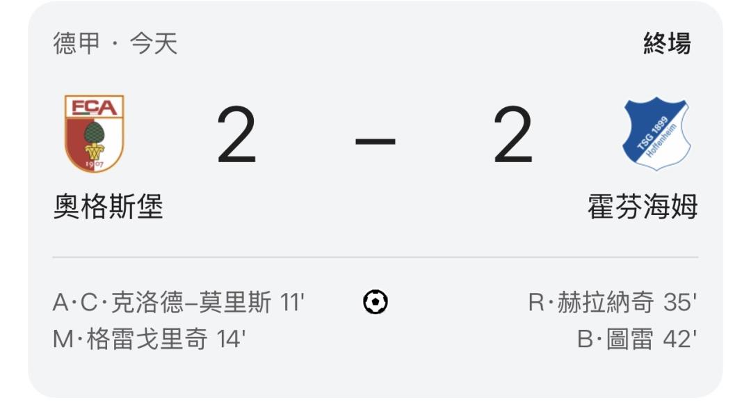 霍芬海姆是奧格斯堡的「苦主」。雙方近 5 次交手,霍芬海姆 2 勝 3 平保持不敗。
