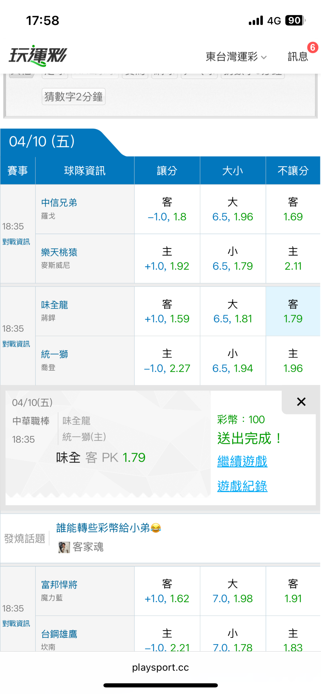 >> 4/10東台中職運彩【主推連過2日】主推信心滿滿(貓場)特價中 -拼中職運彩主推連過3日~
