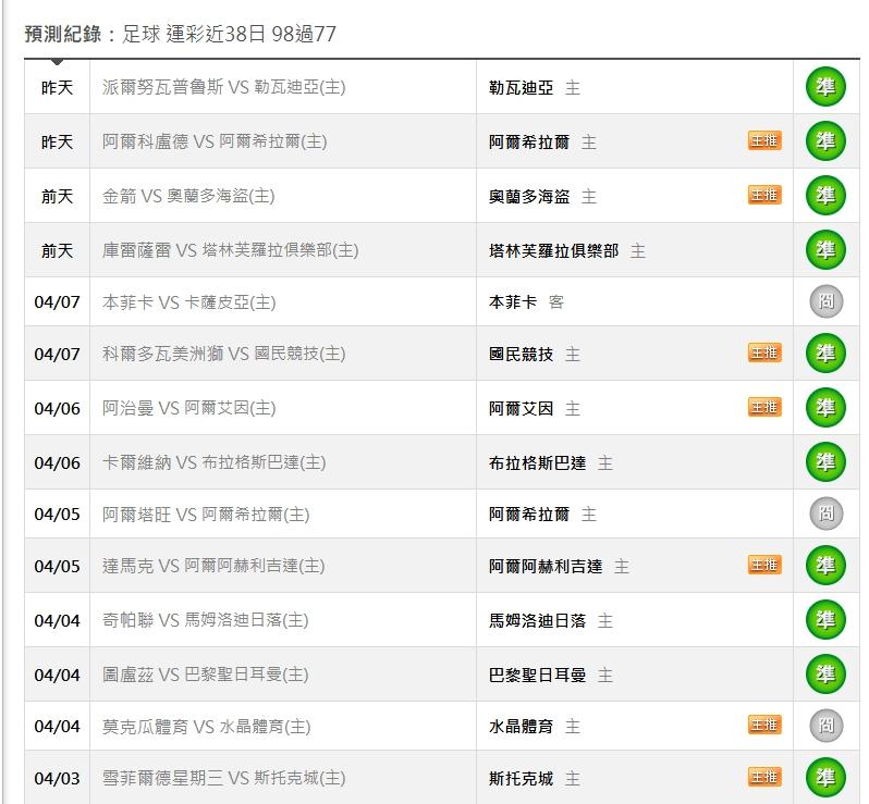 >> 4/11足球 運彩近38日98過77 昨天小叮嚀推薦單場:堤格雷斯2:0正比抓到 明19場單場正比