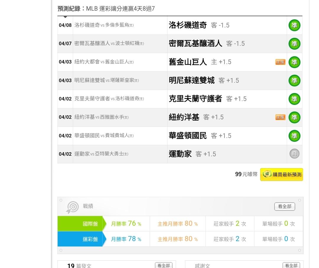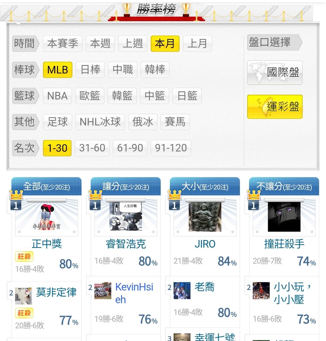 MLB >> MLB 運彩讓分連贏4天8過7 MLB 國際主推近9過8 運彩盤 勝率榜全部 第2名 參考看看
