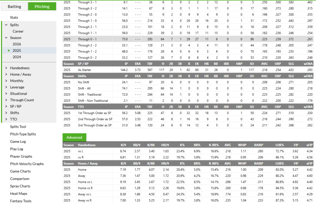 小熊先發今永昇太,四縫跟指叉為武器,四縫為主,接近一半,所以被打的高飛球多,指叉則是大多掉到好球帶下緣,所以他的壞球被追打率很高。球速不快不難掌握,就選到他那顆指叉就行。控球蠻好,生涯BB/9只有1.56,今年目前還算高了。而他今年的直球球速比去年快了一些,表示訓練上有運用更多運動科學。他的四縫線轉速超過2600轉,更有視覺上竄的效果。不過他通常也就投五局,開季通常每一隊揮棒都比較謹慎,大部分投手的Z-Swing%好球帶揮棒率都比往年低。所以控球派的會吃香一些。