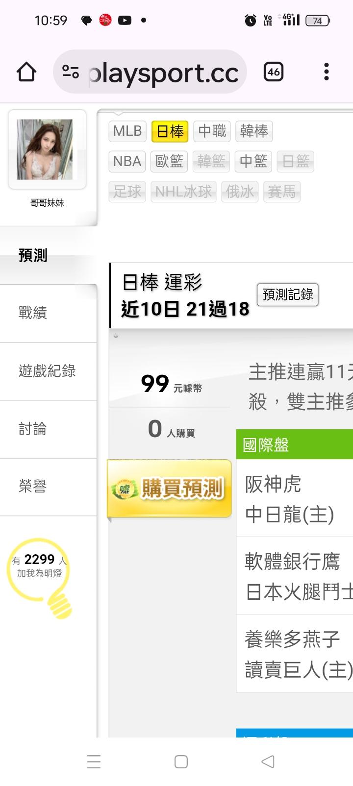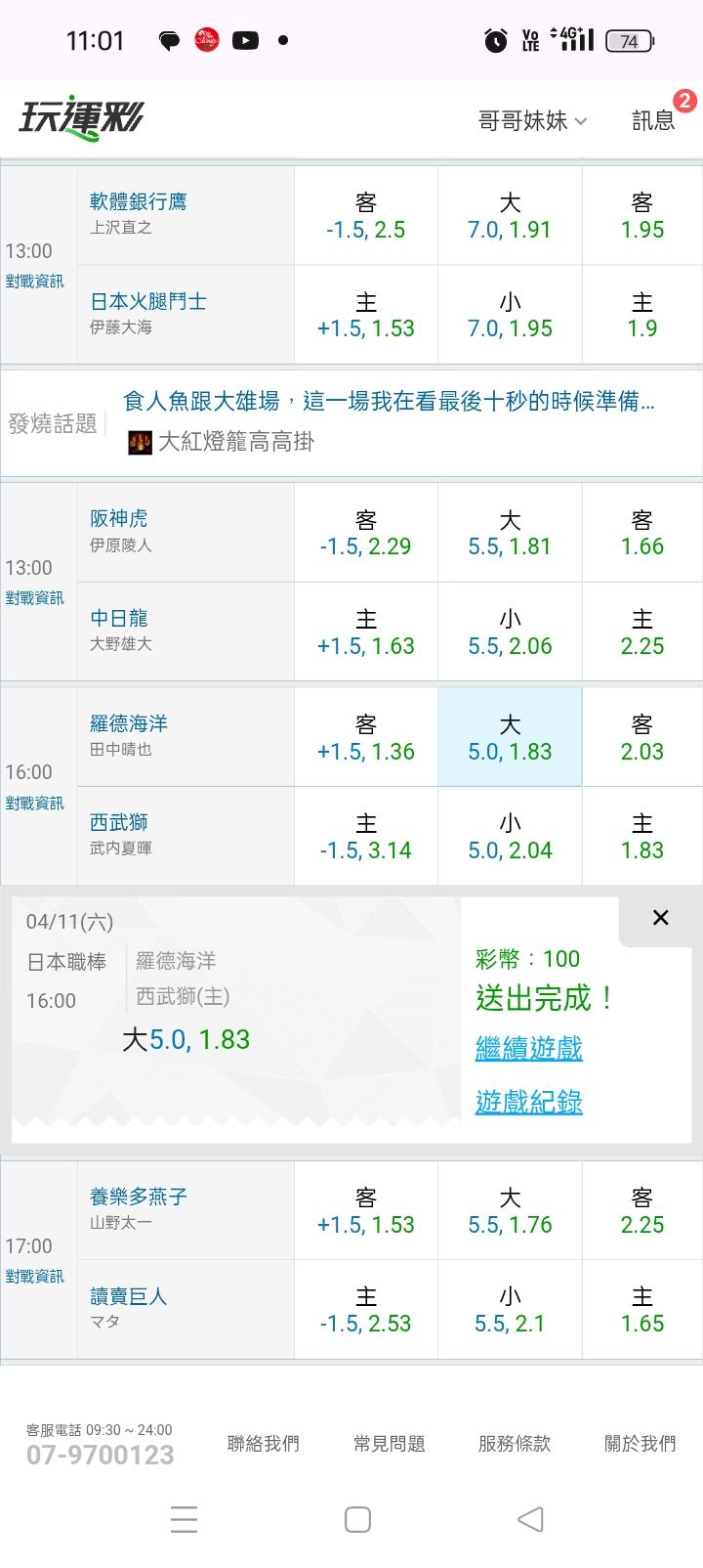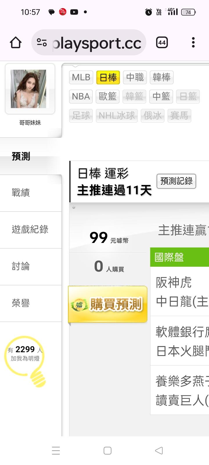 日本職棒 >> 主推連贏11天連贏11天,台彩單場大小分輸贏(軟銀vs火腿)雙主推