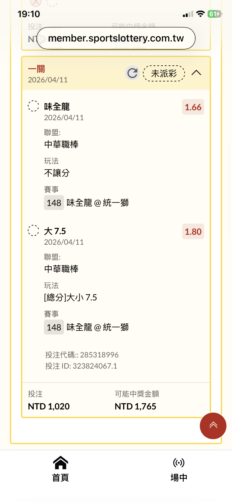 中華職棒 >> 4/11 味全龍vs統一獅 亮單輸贏自負