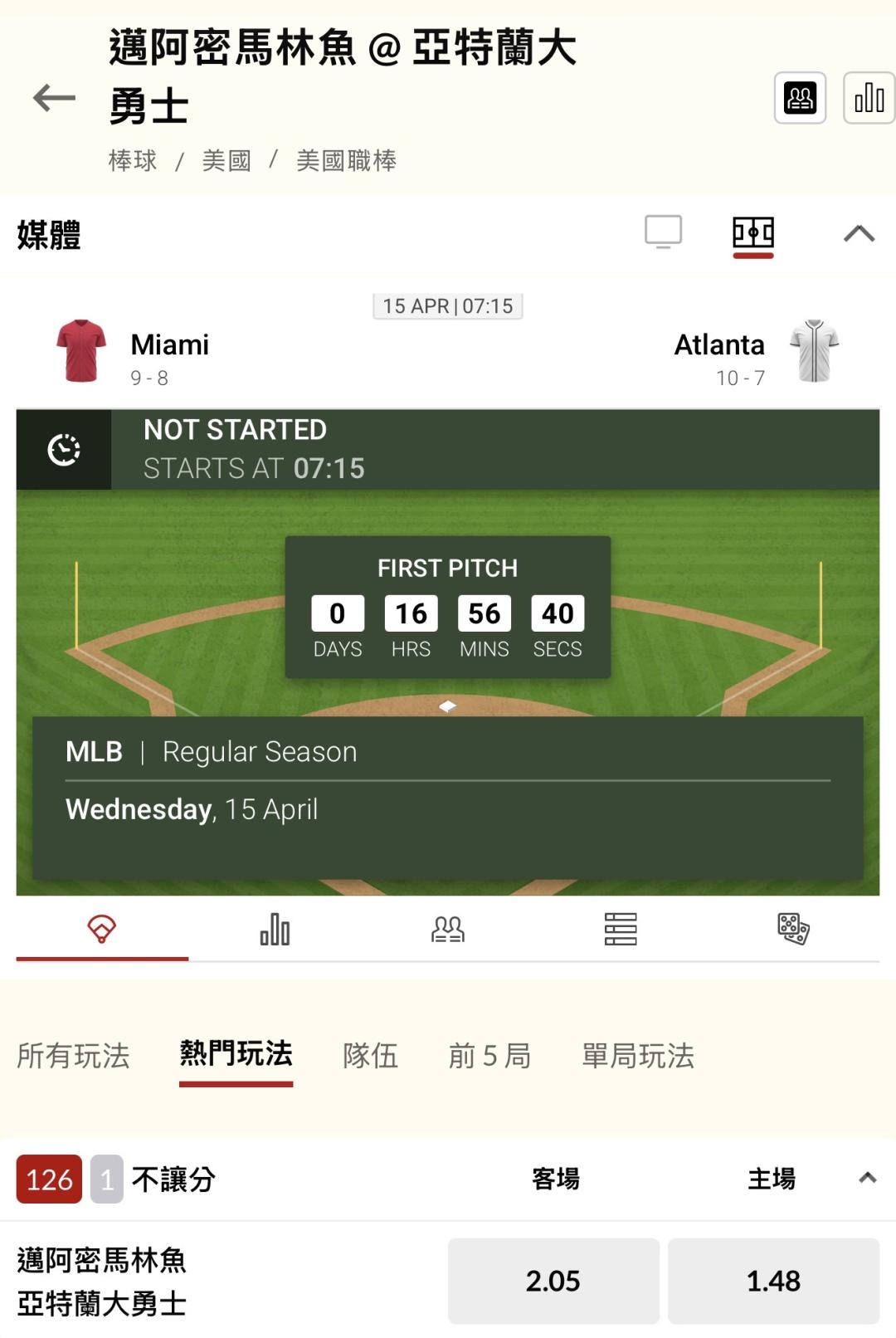MLB >> 你們最愛的「單場 新台幣 10萬」100000元 - 邁阿密馬林魚 VS 亞特蘭大勇士
