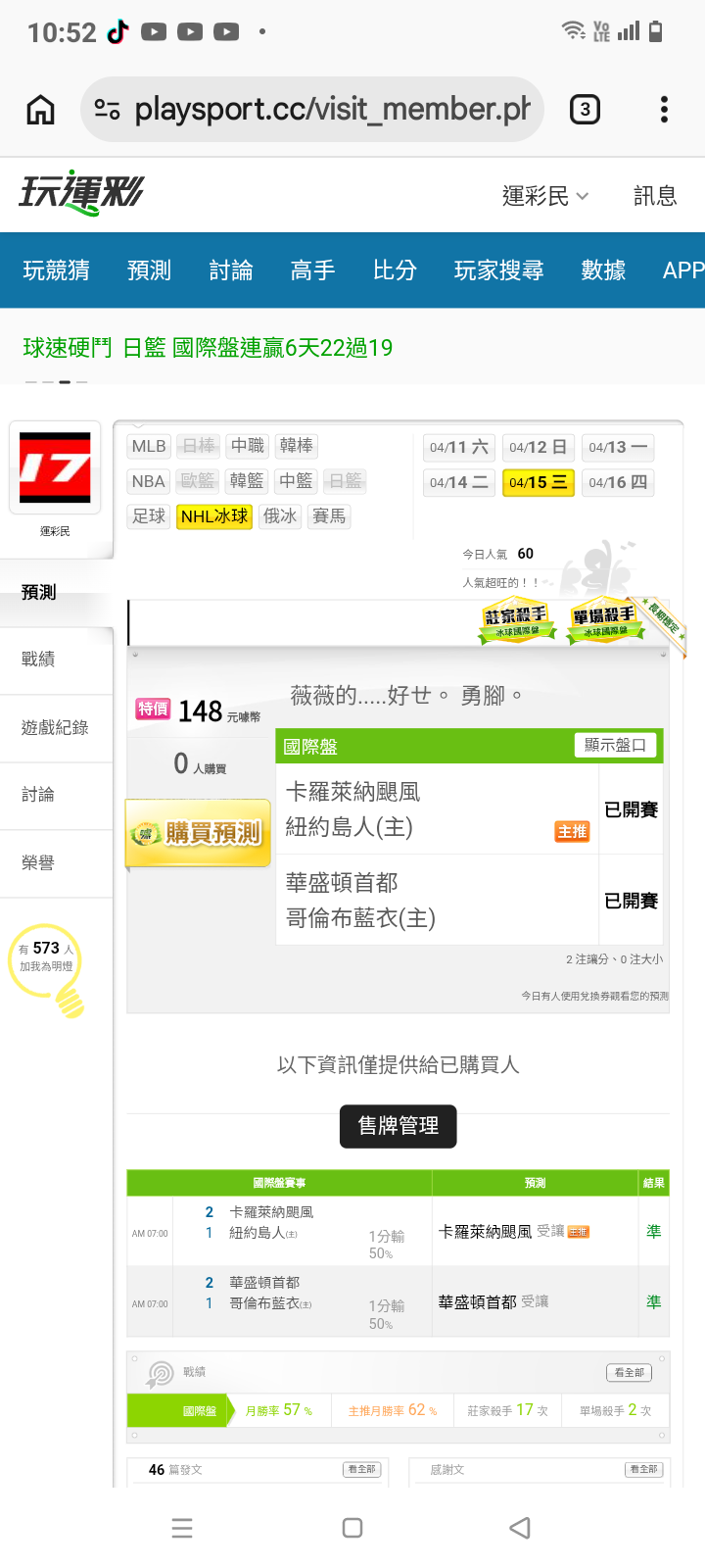 NHL冰球 >> 4月15日..近期玩的不好.@丫☆☆☆☆☆5連莊.莊家殺手。