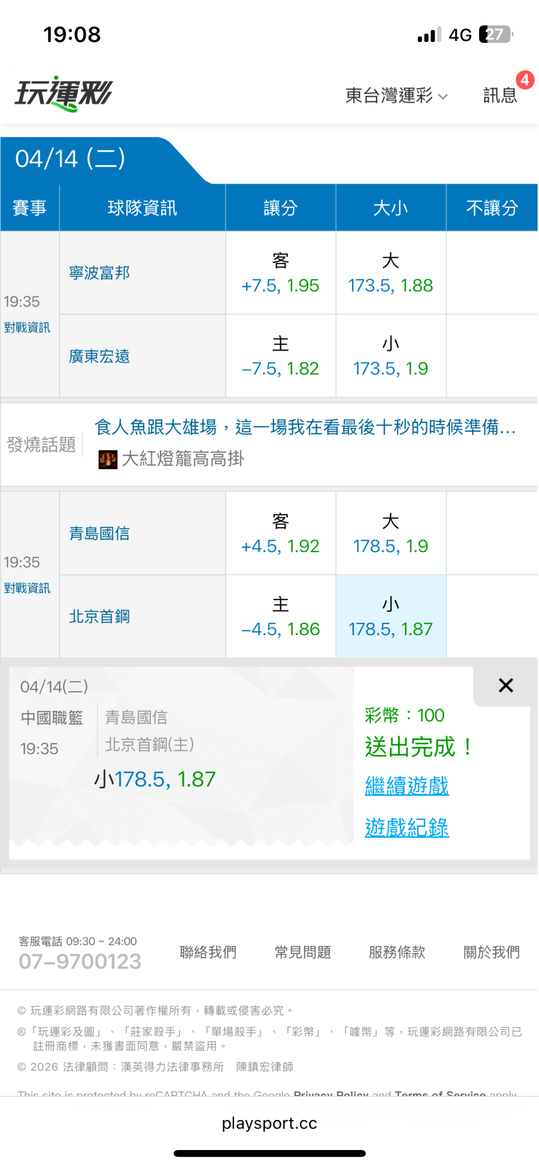 >> 4/14東台中籃國際盤【近28日贏20日】主推信心滿滿(貓場)特價79 喜歡的跟上東台~