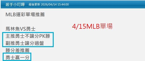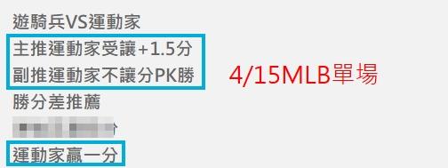 MLB >> 4/16MLB 今天小叮嚀推薦2場單場:勇士PK+贏1分勝分差&運動家受讓+PK+贏1分都抓到