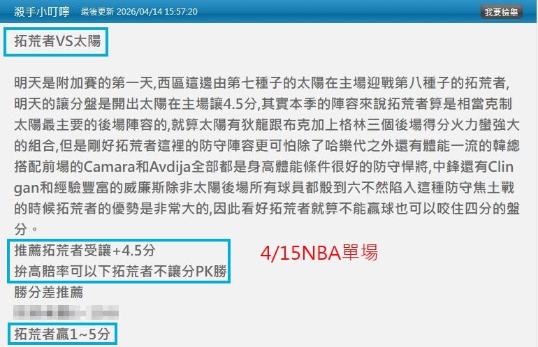 今天4/15小叮嚀分析文推薦單場:拓荒者VS太陽